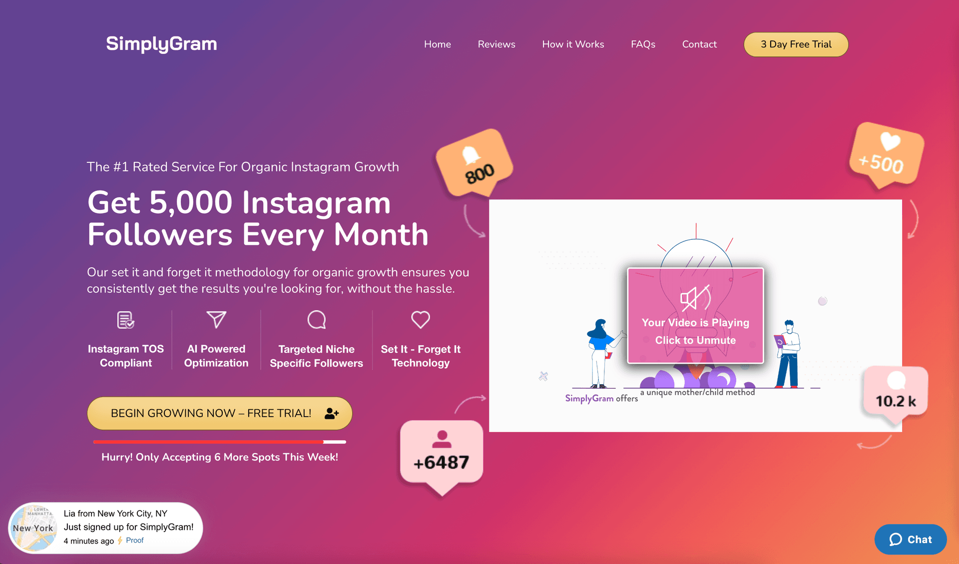 SimplyGram presents itself as an organic Instagram growth service, promising to help users gain thousands of new followers each month. With bold claims of adding up to 5,000 targeted, niche-specific followers monthly, SimplyGram certainly catches the eye of those looking to boost their Instagram presence quickly.