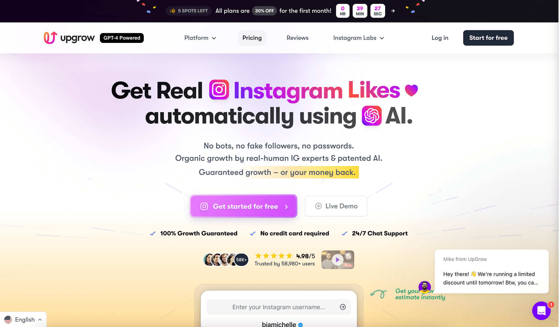 UpGrow is an AI-powered Instagram growth service that claims to help users gain real, active followers on their Instagram accounts. The platform markets itself as a safe, Instagram-compliant solution for organic growth, promising to deliver authentic followers without using bots or fake accounts. UpGrow positions its service as an alternative to traditional social media marketing teams, offering automated growth strategies at a fraction of the cost.